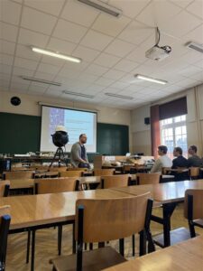 W oprowadzanie po laboratoriach byli zaangażowani także nasi studenci, którzy towarzyszyli norweskiej grupie i pomagali w poruszaniu się między poszczególnymi miejscami wizyty. Dzięki temu goście mogli przy okazji uzyskać praktyczne wskazówki i krótkie spostrzeżenia dotyczące studiów oraz życia akademickiego z perspektywy osób studiujących na co dzień na naszym Wydziale.
