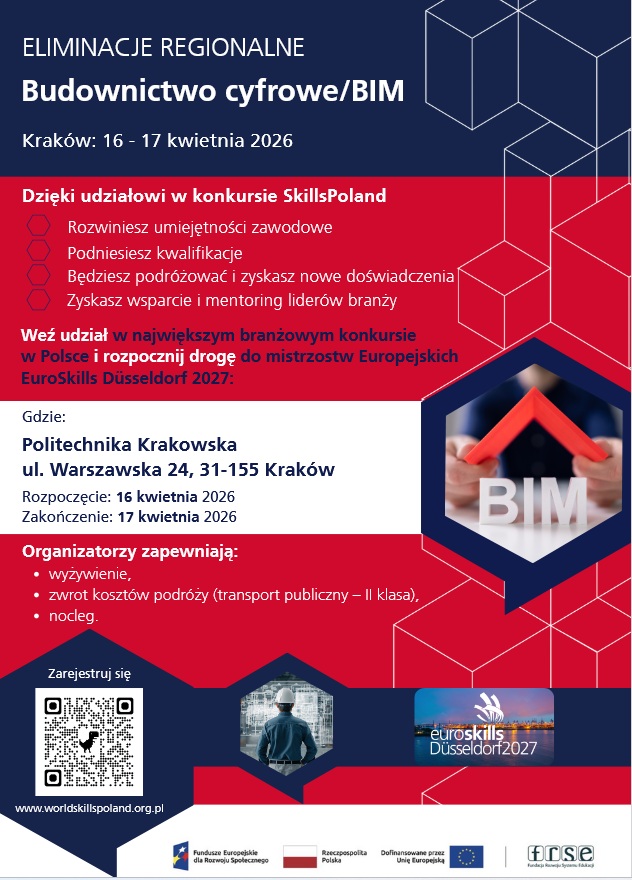 W dniach 16 i 17 kwietnia 2026 r. na Wydziale Inżynierii Lądowej Politechniki Krakowskiej odbędą się Eliminacje Regionalne Worldskills Poland w konkurencji Budownictwo Cyfrowe/BIM.