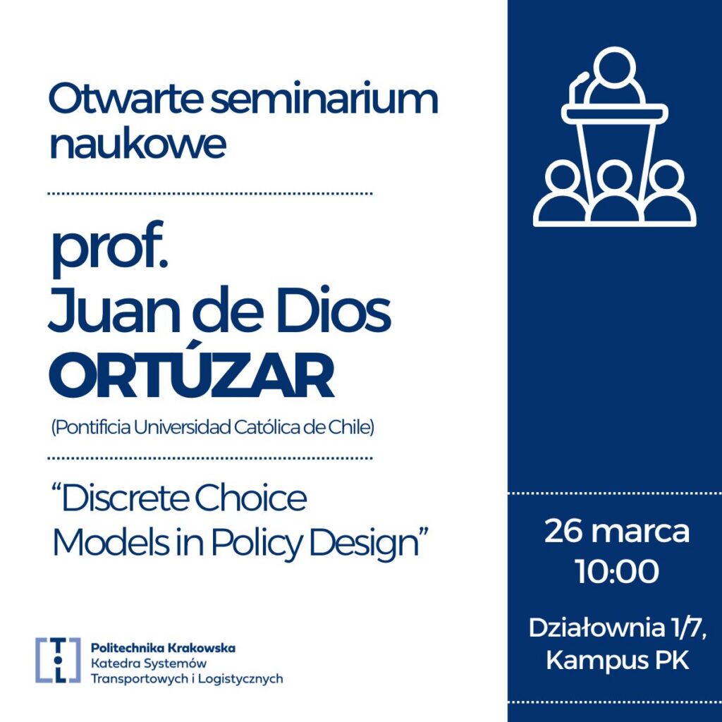 Wszystkich zainteresowanych tematyką modelowania w transporcie zapraszamy na seminarium “Discrete Choice Models in Policy Design” prowadzone przez Profesora w czwartek, 26.03.2026 br. Spotkanie odbędzie się o godz. 10:00, w budynku Działownia, w sal1 1/7, na Kampusie przy ul. Warszawskiej 24.