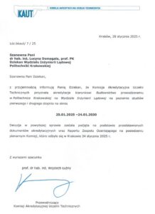 W dniu 30 stycznia 2025 r. na Wydział Inżynierii Lądowej Politechniki Krakowskiej wpłynęła decyzja po listopadowej wizytacji członków Komisji Akredytacyjnej Uczelni Technicznych (KAUT).