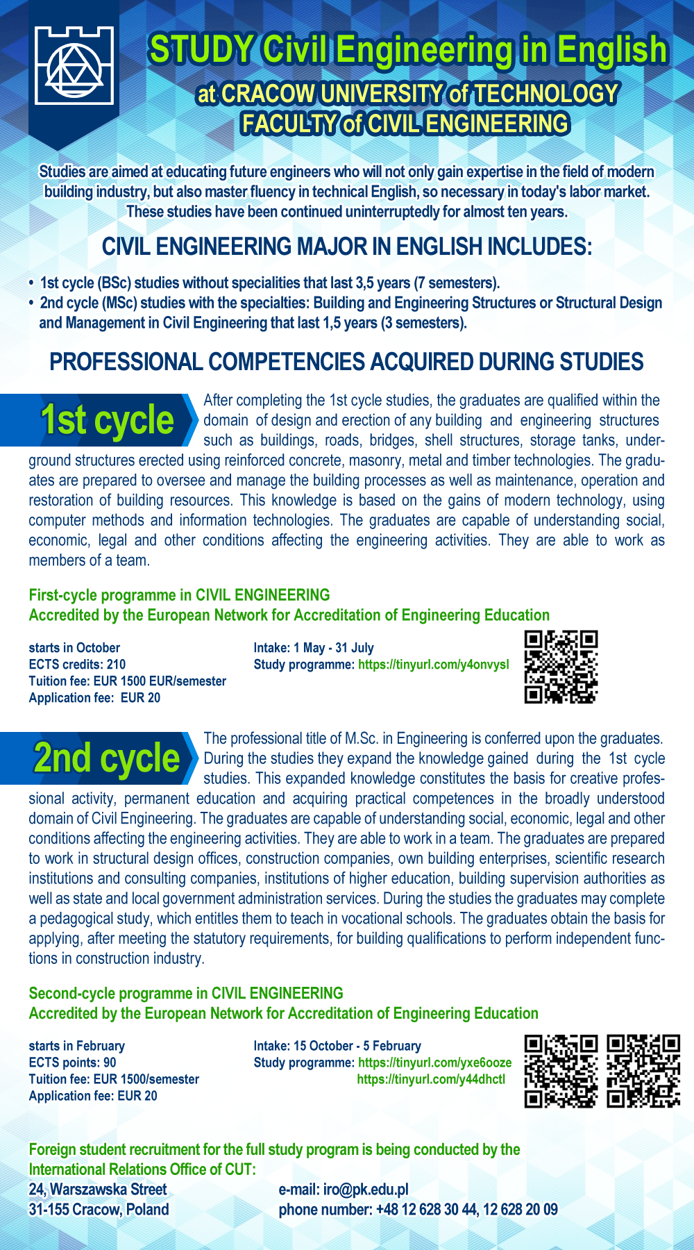 You are heartily welcome to cooperate with Civil Engineering Faculty of Cracow University of Technology. Young people are encouraged to enroll as students. Graduation from our Faculty opens very interesting professional opportunities.
