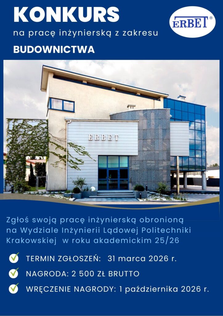 Wydział Inżynierii Lądowej Politechniki Krakowskiej ogłasza kolejną edycję konkursu ERBET na najlepszą pracę dyplomową z zakresu budownictwa, którego celem jest promowanie prac dyplomowych o wysokim poziomie merytorycznym