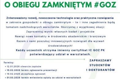 Interdyscyplinarne Centrum Gospodarki Obiegu Zamkniętego IC-GOZ Politechniki Krakowskiej z okazji ŚWIATOWYCH DNI RECYKLINGU ma zaszczyt zaprosić Państwa na: „WARSZTATY GOSPODARKI O OBIEGU ZAMKNIĘTYM (GOZ)”. Warsztaty skierowane są do studentów, doktorantów oraz członków…