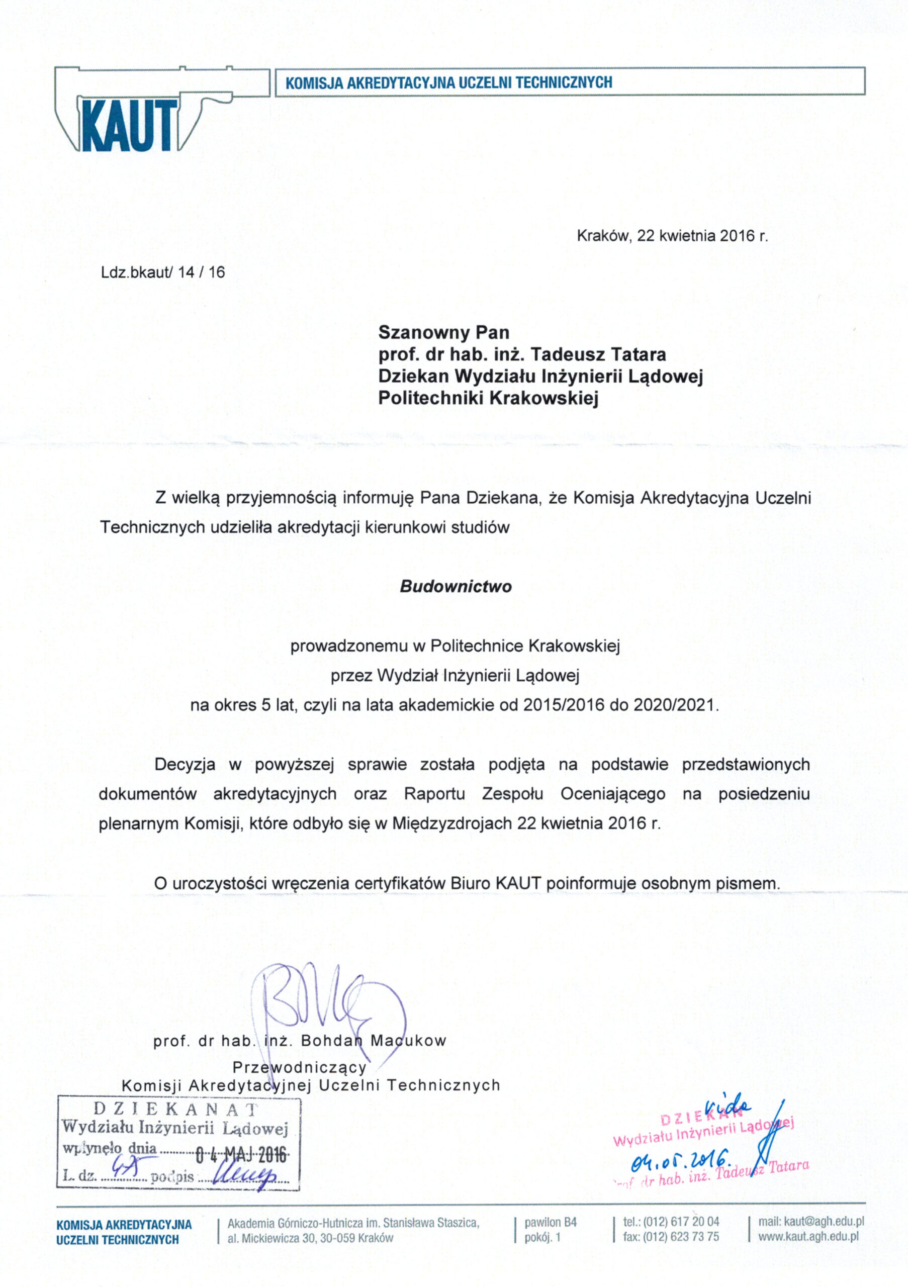 - Akredytacja Komisji Akredytacyjnej Uczelni Technicznych (KAUT) – budownictwo