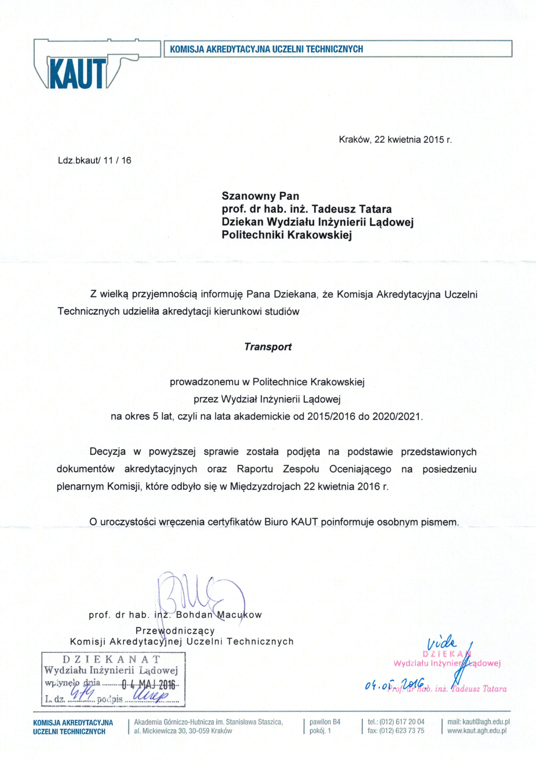 Akredytacja Państwowej Komisji Akredytacyjnej jest obligatoryjna i odbywa się co 5 lat. Do akredytacji Komisji Akredytacyjnej Uczelni Technicznych Wydział zgłosił się sam. Posiadanie certyfikatu KAUT jest prestiżowym wyróżnieniem (KAUT jest członkiem ENAEE – European Network for Accreditation of Engineering Education). Na kierunku Transport WIL PK otrzymał akredytację KAUT jako pierwszy (2015/2016 rok). Informacja o akredytacjach udzielonych Wydziałowi znajduje się w suplementach do dyplomu ukończenia studiów wyższych.