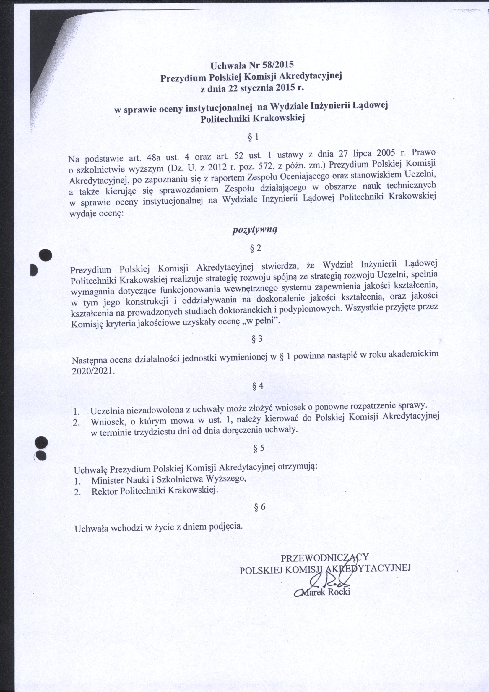 - Akredytacja instytucjonalna Polskiej Komisji Akredytacyjnej (PKA) – budownictwo i transport